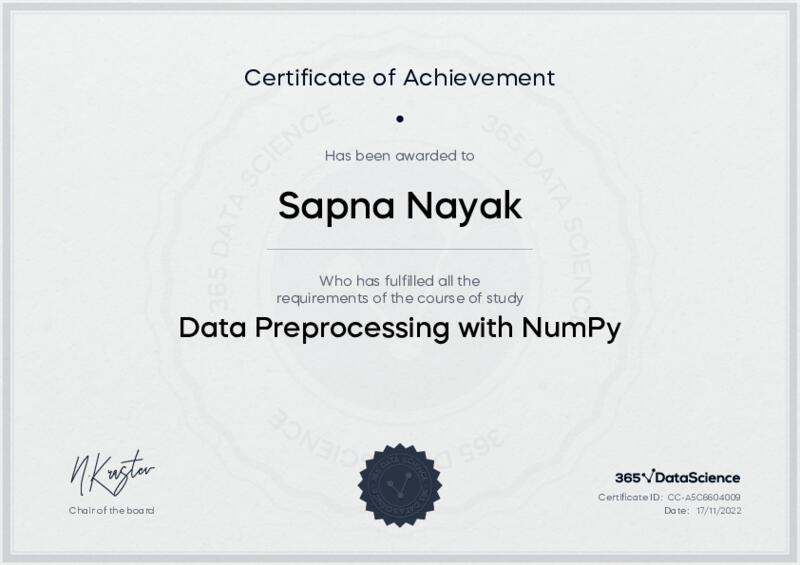 This user has been awarded the Data Preprocessing with NumPy Certificate for successfully completing the course exam. Holding this certificate demonstrates their proficiency on the topic and signifies they are qualified to apply their newly acquired expertise in the fields of data analytics and data science.