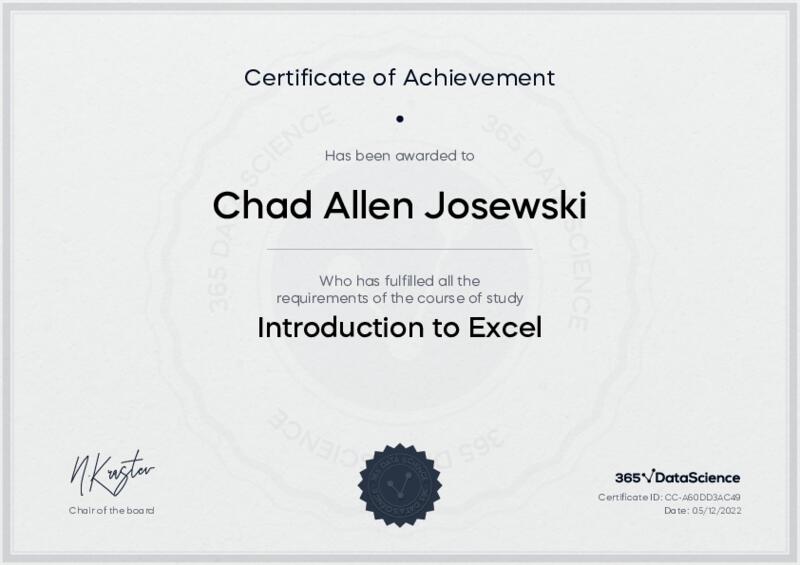 This user has been awarded the Introduction to Excel Certificate for successfully completing the course exam. Holding this certificate demonstrates their proficiency on the topic and signifies they are qualified to apply their newly acquired expertise in the fields of data analytics and data science.