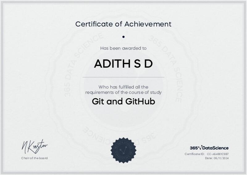 This user has been awarded the Git and GitHub Certificate for successfully completing the course exam. Holding this certificate demonstrates their proficiency on the topic and signifies they are qualified to apply their newly acquired expertise in the fields of data analytics and data science.