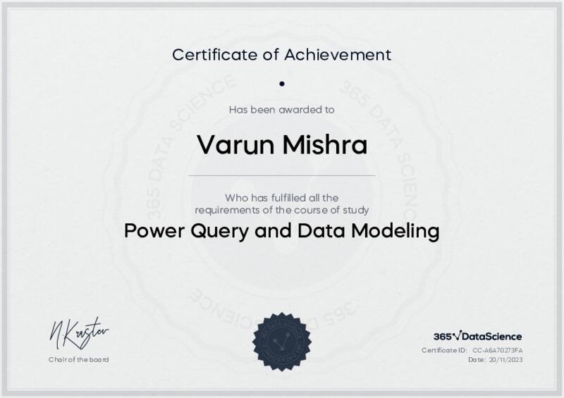 This user has been awarded the Power Query and Data Modeling Certificate for successfully completing the course exam. Holding this certificate demonstrates their proficiency on the topic and signifies they are qualified to apply their newly acquired expertise in the fields of data analytics and data science.