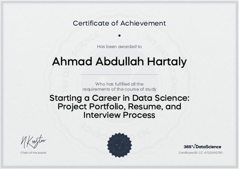 This user has been awarded the Starting a Career in Data Science: Project Portfolio, Resume, and Interview Process Certificate for successfully completing the course exam. Holding this certificate demonstrates their proficiency on the topic and signifies they are qualified to apply their newly acquired expertise in the fields of data analytics and data science.