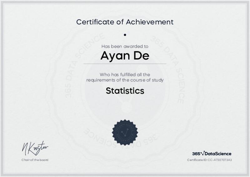 This user has been awarded the Statistics Certificate for successfully completing the course exam. Holding this certificate demonstrates their proficiency on the topic and signifies they are qualified to apply their newly acquired expertise in the fields of data analytics and data science.