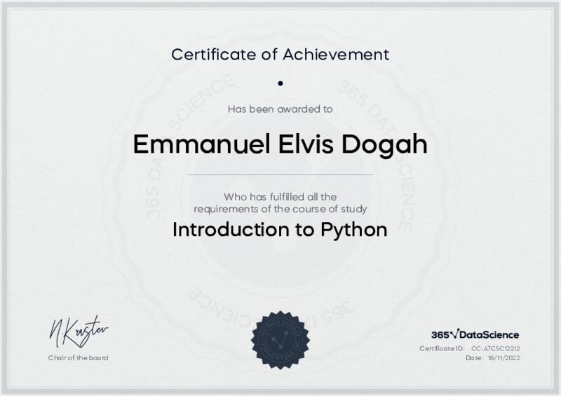 This user has been awarded the Introduction to Python Certificate for successfully completing the course exam. Holding this certificate demonstrates their proficiency on the topic and signifies they are qualified to apply their newly acquired expertise in the fields of data analytics and data science.