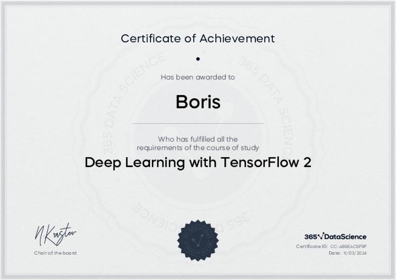 This user has been awarded the Deep Learning with TensorFlow 2 Certificate for successfully completing the course exam. Holding this certificate demonstrates their proficiency on the topic and signifies they are qualified to apply their newly acquired expertise in the fields of data analytics and data science.