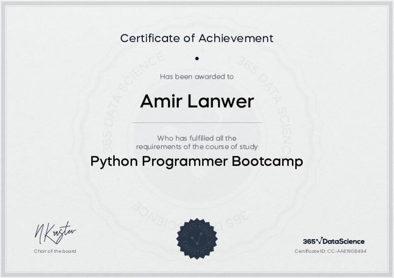 This user has been awarded the Python Programmer Bootcamp Certificate for successfully completing the course exam. Holding this certificate demonstrates their proficiency on the topic and signifies they are qualified to apply their newly acquired expertise in the fields of data analytics and data science.