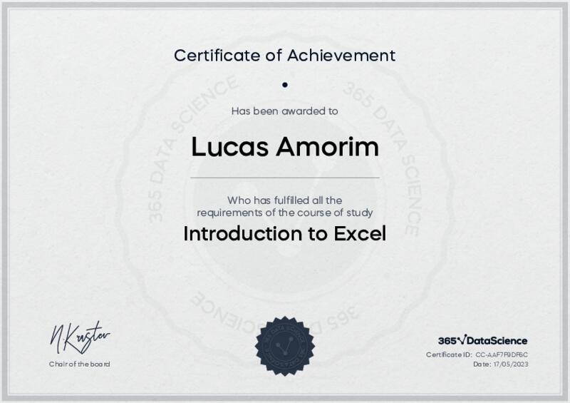 This user has been awarded the Introduction to Excel Certificate for successfully completing the course exam. Holding this certificate demonstrates their proficiency on the topic and signifies they are qualified to apply their newly acquired expertise in the fields of data analytics and data science.