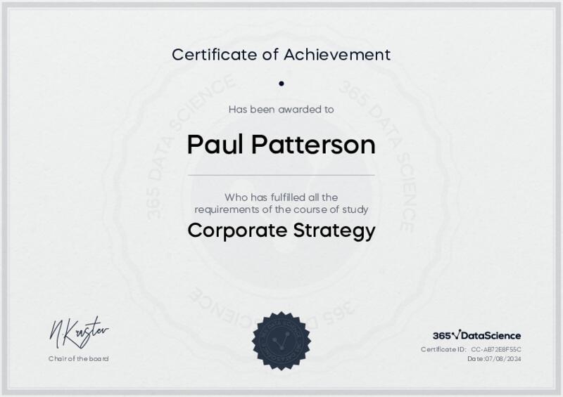 This user has been awarded the Corporate Strategy Certificate for successfully completing the course exam. Holding this certificate demonstrates their proficiency on the topic and signifies they are qualified to apply their newly acquired expertise in the fields of data analytics and data science.