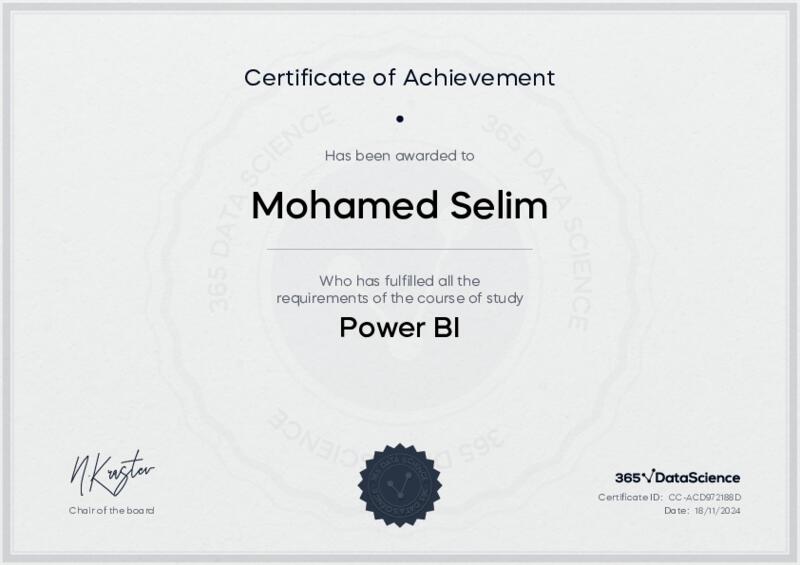 This user has been awarded the Power BI Certificate for successfully completing the course exam. Holding this certificate demonstrates their proficiency on the topic and signifies they are qualified to apply their newly acquired expertise in the fields of data analytics and data science.