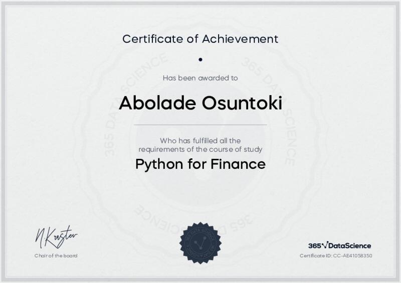 This user has been awarded the Python for Finance Certificate for successfully completing the course exam. Holding this certificate demonstrates their proficiency on the topic and signifies they are qualified to apply their newly acquired expertise in the fields of data analytics and data science.