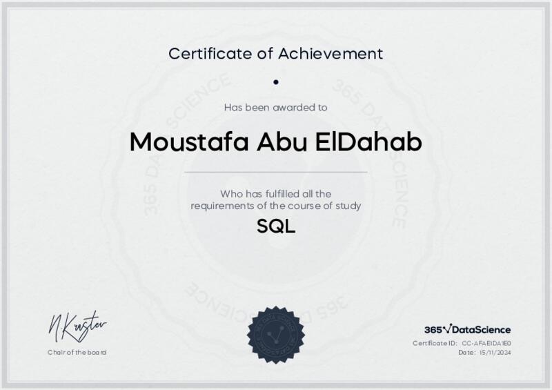 This user has been awarded the SQL Certificate for successfully completing the course exam. Holding this certificate demonstrates their proficiency on the topic and signifies they are qualified to apply their newly acquired expertise in the fields of data analytics and data science.