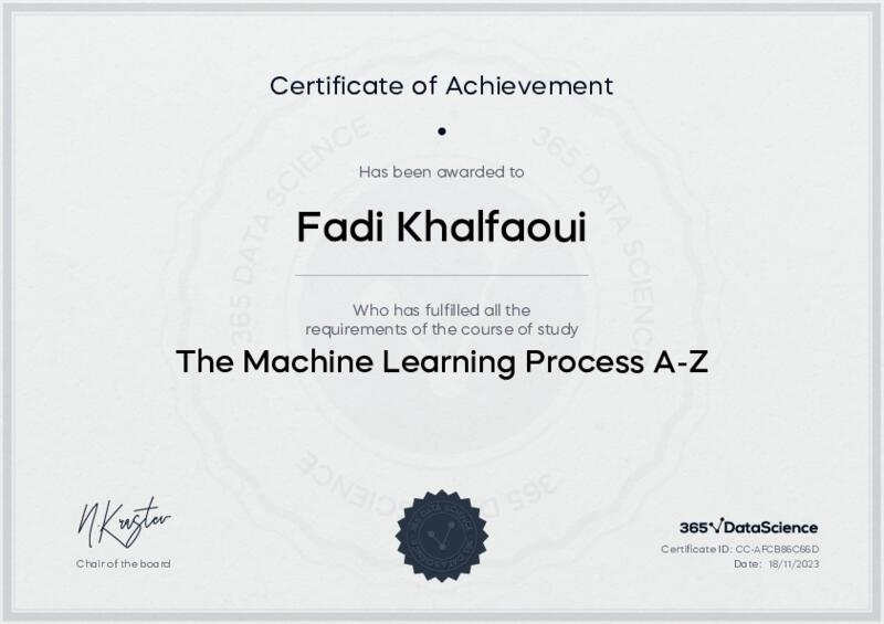 This user has been awarded the The Machine Learning Process A-Z Certificate for successfully completing the course exam. Holding this certificate demonstrates their proficiency on the topic and signifies they are qualified to apply their newly acquired expertise in the fields of data analytics and data science.