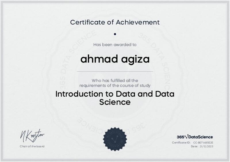 This user has been awarded the Introduction to Data and Data Science Certificate for successfully completing the course exam. Holding this certificate demonstrates their proficiency on the topic and signifies they are qualified to apply their newly acquired expertise in the fields of data analytics and data science.