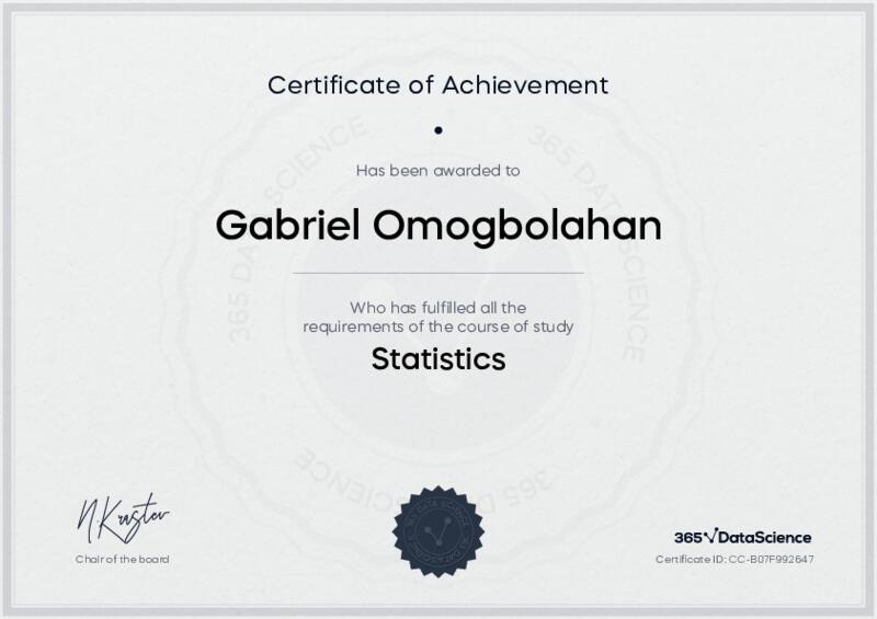 This user has been awarded the Statistics Certificate for successfully completing the course exam. Holding this certificate demonstrates their proficiency on the topic and signifies they are qualified to apply their newly acquired expertise in the fields of data analytics and data science.