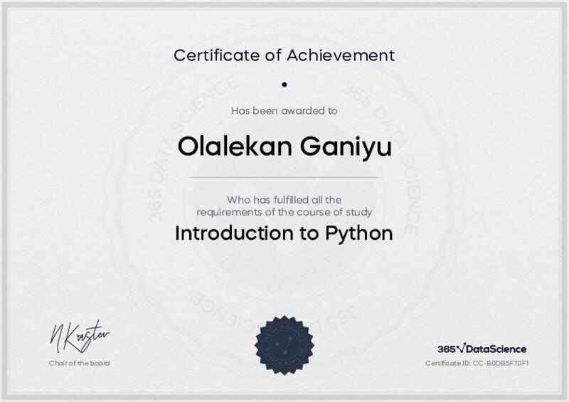This user has been awarded the Introduction to Python Certificate for successfully completing the course exam. Holding this certificate demonstrates their proficiency on the topic and signifies they are qualified to apply their newly acquired expertise in the fields of data analytics and data science.