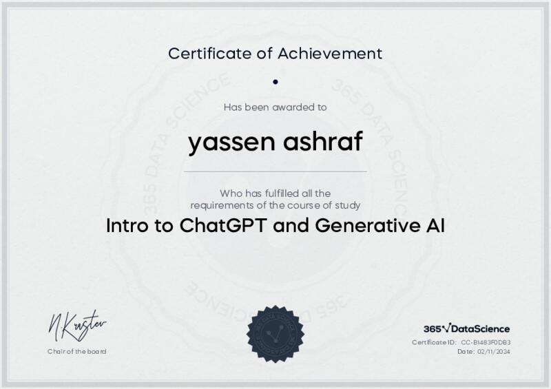This user has been awarded the Intro to ChatGPT and Generative AI Certificate for successfully completing the course exam. Holding this certificate demonstrates their proficiency on the topic and signifies they are qualified to apply their newly acquired expertise in the fields of data analytics and data science.