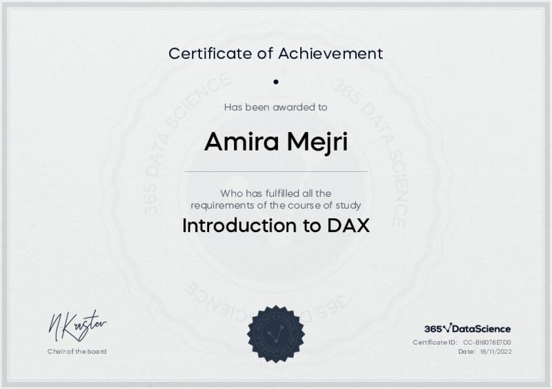 This user has been awarded the Introduction to DAX Certificate for successfully completing the course exam. Holding this certificate demonstrates their proficiency on the topic and signifies they are qualified to apply their newly acquired expertise in the fields of data analytics and data science.