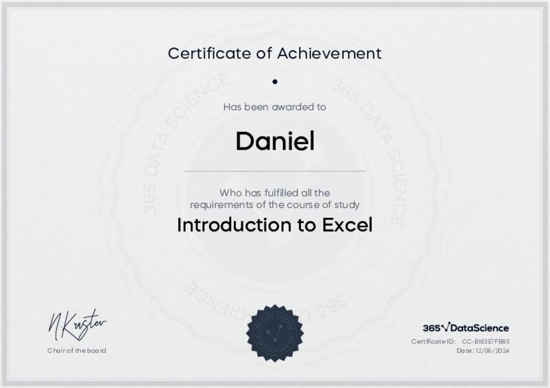 This user has been awarded the Introduction to Excel Certificate for successfully completing the course exam. Holding this certificate demonstrates their proficiency on the topic and signifies they are qualified to apply their newly acquired expertise in the fields of data analytics and data science.