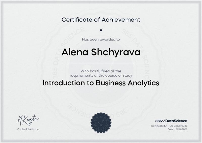 This user has been awarded the Introduction to Business Analytics Certificate for successfully completing the course exam. Holding this certificate demonstrates their proficiency on the topic and signifies they are qualified to apply their newly acquired expertise in the fields of data analytics and data science.