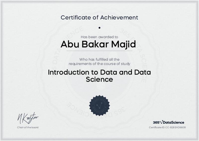 This user has been awarded the Introduction to Data and Data Science Certificate for successfully completing the course exam. Holding this certificate demonstrates their proficiency on the topic and signifies they are qualified to apply their newly acquired expertise in the fields of data analytics and data science.