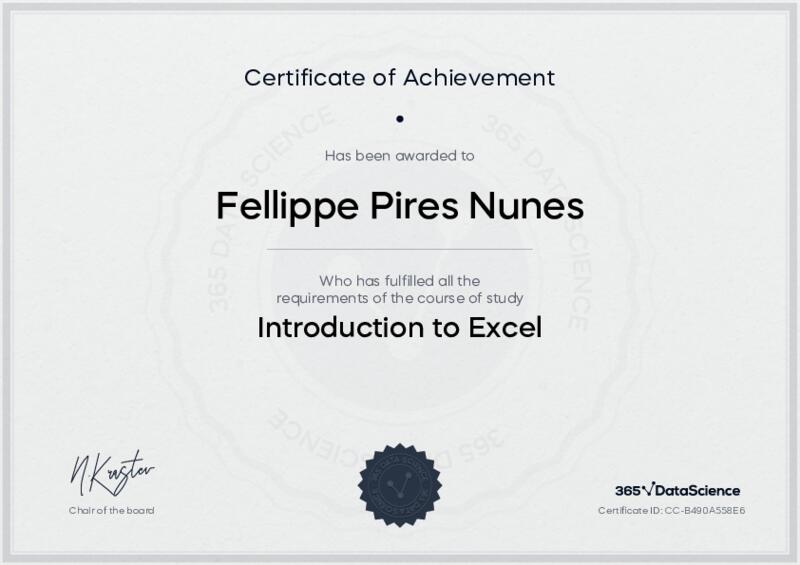 This user has been awarded the Introduction to Excel Certificate for successfully completing the course exam. Holding this certificate demonstrates their proficiency on the topic and signifies they are qualified to apply their newly acquired expertise in the fields of data analytics and data science.