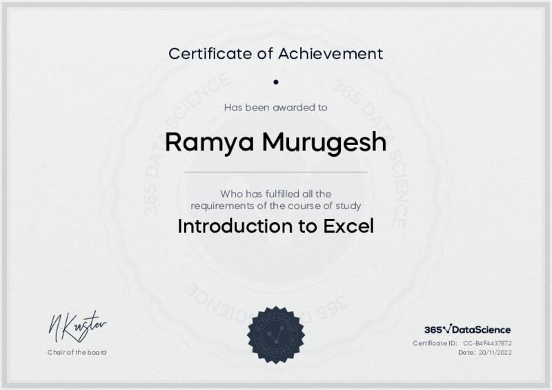 This user has been awarded the Introduction to Excel Certificate for successfully completing the course exam. Holding this certificate demonstrates their proficiency on the topic and signifies they are qualified to apply their newly acquired expertise in the fields of data analytics and data science.