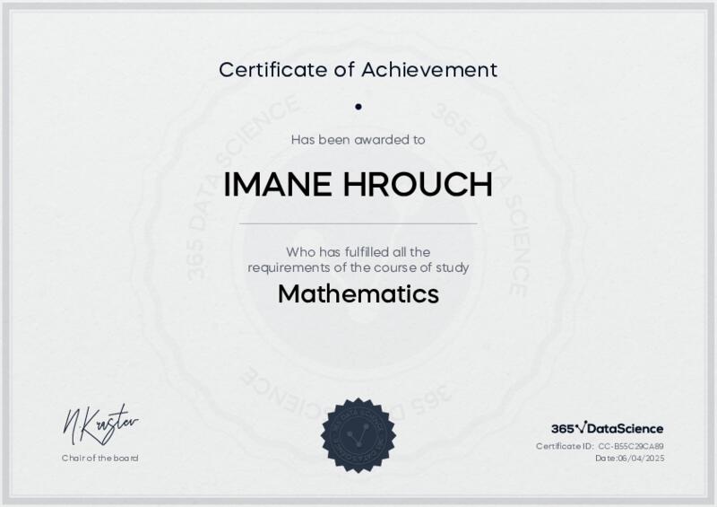 This user has been awarded the Mathematics Certificate for successfully completing the course exam. Holding this certificate demonstrates their proficiency on the topic and signifies they are qualified to apply their newly acquired expertise in the fields of data analytics and data science.