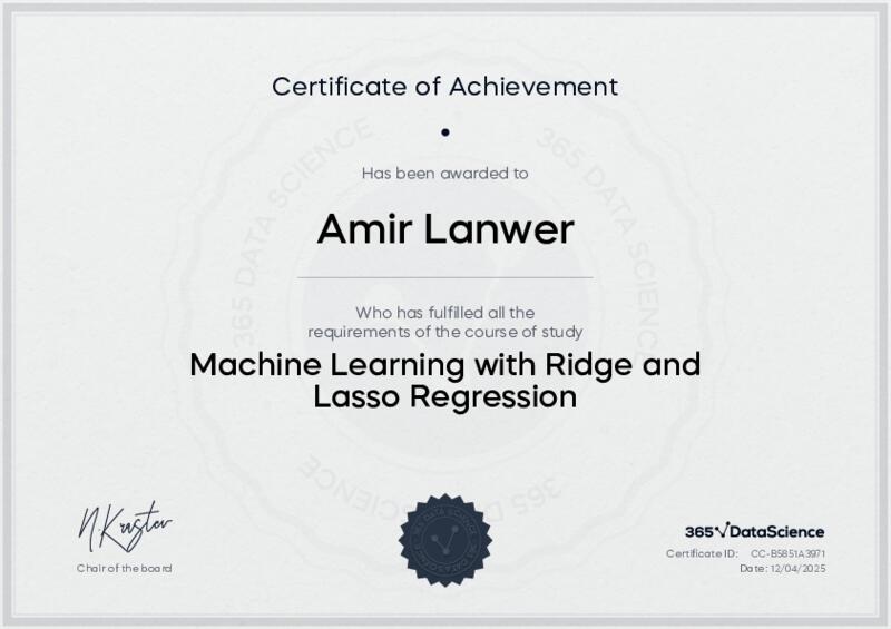 This user has been awarded the Machine Learning with Ridge and Lasso Regression Certificate for successfully completing the course exam. Holding this certificate demonstrates their proficiency on the topic and signifies they are qualified to apply their newly acquired expertise in the fields of data analytics and data science.