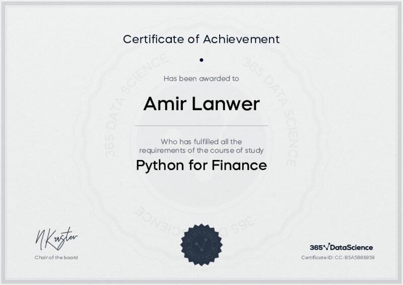 This user has been awarded the Python for Finance Certificate for successfully completing the course exam. Holding this certificate demonstrates their proficiency on the topic and signifies they are qualified to apply their newly acquired expertise in the fields of data analytics and data science.