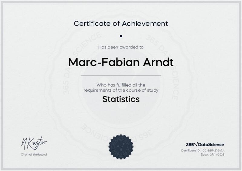 This user has been awarded the Statistics Certificate for successfully completing the course exam. Holding this certificate demonstrates their proficiency on the topic and signifies they are qualified to apply their newly acquired expertise in the fields of data analytics and data science.