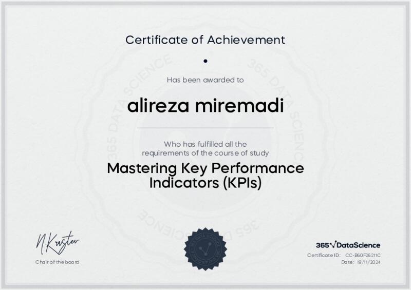 This user has been awarded the Mastering Key Performance Indicators (KPIs) Certificate for successfully completing the course exam. Holding this certificate demonstrates their proficiency on the topic and signifies they are qualified to apply their newly acquired expertise in the fields of data analytics and data science.