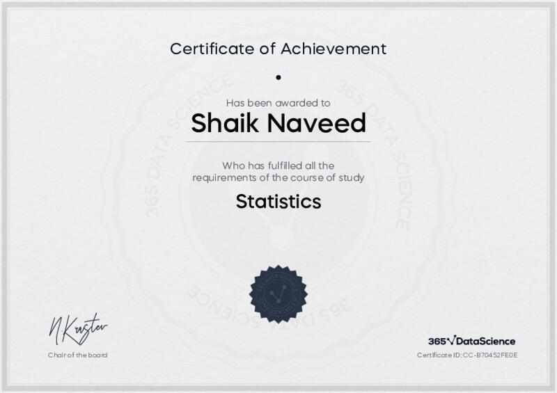 This user has been awarded the Statistics Certificate for successfully completing the course exam. Holding this certificate demonstrates their proficiency on the topic and signifies they are qualified to apply their newly acquired expertise in the fields of data analytics and data science.