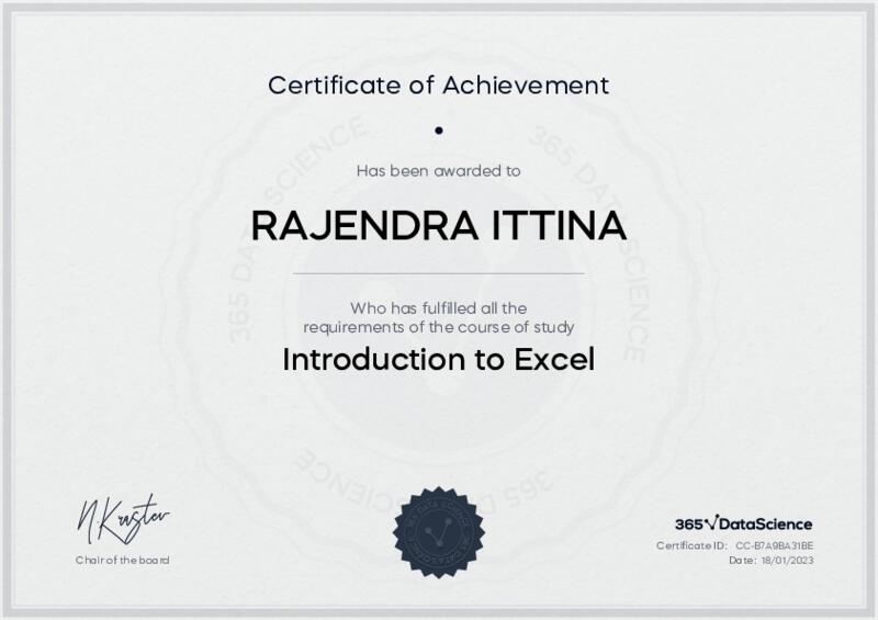 This user has been awarded the Introduction to Excel Certificate for successfully completing the course exam. Holding this certificate demonstrates their proficiency on the topic and signifies they are qualified to apply their newly acquired expertise in the fields of data analytics and data science.