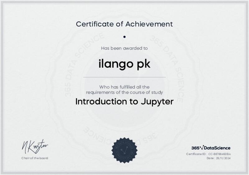 This user has been awarded the Introduction to Jupyter Certificate for successfully completing the course exam. Holding this certificate demonstrates their proficiency on the topic and signifies they are qualified to apply their newly acquired expertise in the fields of data analytics and data science.