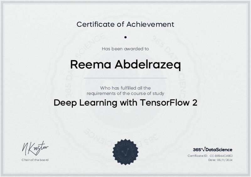 This user has been awarded the Deep Learning with TensorFlow 2 Certificate for successfully completing the course exam. Holding this certificate demonstrates their proficiency on the topic and signifies they are qualified to apply their newly acquired expertise in the fields of data analytics and data science.