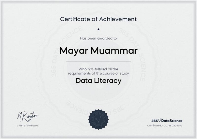 This user has been awarded the Data Literacy Certificate for successfully completing the course exam. Holding this certificate demonstrates their proficiency on the topic and signifies they are qualified to apply their newly acquired expertise in the fields of data analytics and data science.