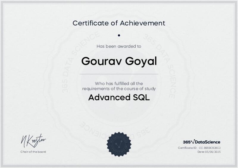 This user has been awarded the Advanced SQL Certificate for successfully completing the course exam. Holding this certificate demonstrates their proficiency on the topic and signifies they are qualified to apply their newly acquired expertise in the fields of data analytics and data science.