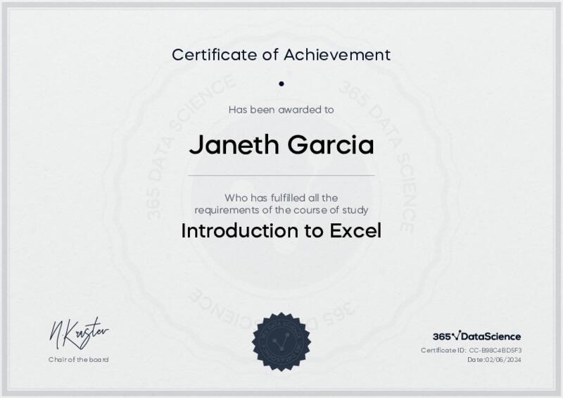 This user has been awarded the Introduction to Excel Certificate for successfully completing the course exam. Holding this certificate demonstrates their proficiency on the topic and signifies they are qualified to apply their newly acquired expertise in the fields of data analytics and data science.