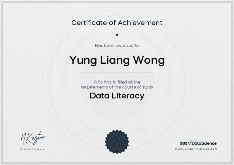 This user has been awarded the Data Literacy Certificate for successfully completing the course exam. Holding this certificate demonstrates their proficiency on the topic and signifies they are qualified to apply their newly acquired expertise in the fields of data analytics and data science.
