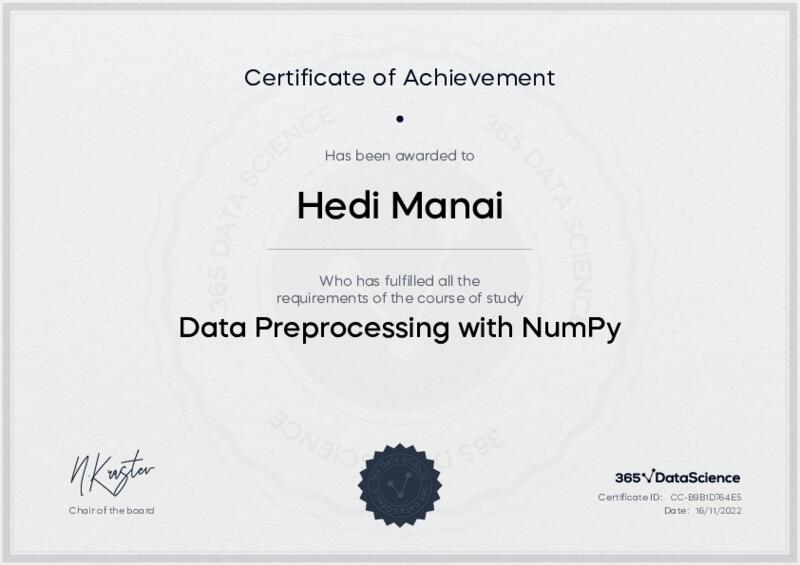 This user has been awarded the Data Preprocessing with NumPy Certificate for successfully completing the course exam. Holding this certificate demonstrates their proficiency on the topic and signifies they are qualified to apply their newly acquired expertise in the fields of data analytics and data science.