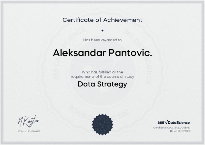 This user has been awarded the Data Strategy Certificate for successfully completing the course exam. Holding this certificate demonstrates their proficiency on the topic and signifies they are qualified to apply their newly acquired expertise in the fields of data analytics and data science.