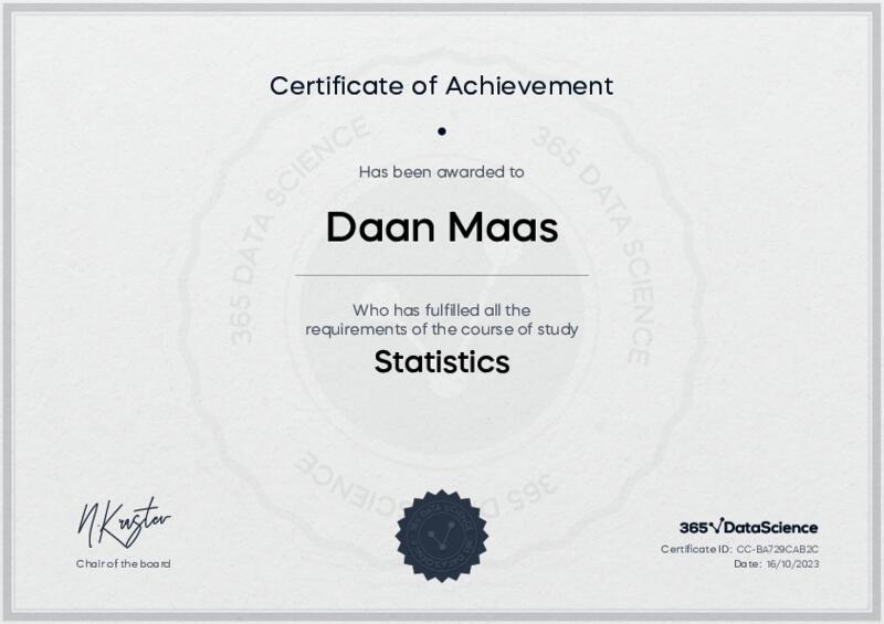 This user has been awarded the Statistics Certificate for successfully completing the course exam. Holding this certificate demonstrates their proficiency on the topic and signifies they are qualified to apply their newly acquired expertise in the fields of data analytics and data science.