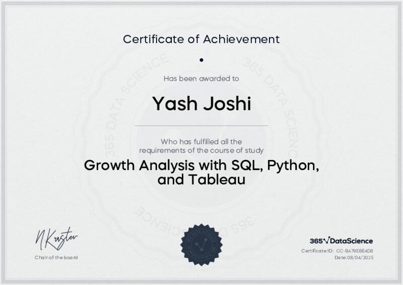 This user has been awarded the Growth Analysis with SQL, Python, and Tableau Certificate for successfully completing the course exam. Holding this certificate demonstrates their proficiency on the topic and signifies they are qualified to apply their newly acquired expertise in the fields of data analytics and data science.