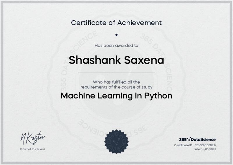This user has been awarded the Machine Learning in Python Certificate for successfully completing the course exam. Holding this certificate demonstrates their proficiency on the topic and signifies they are qualified to apply their newly acquired expertise in the fields of data analytics and data science.