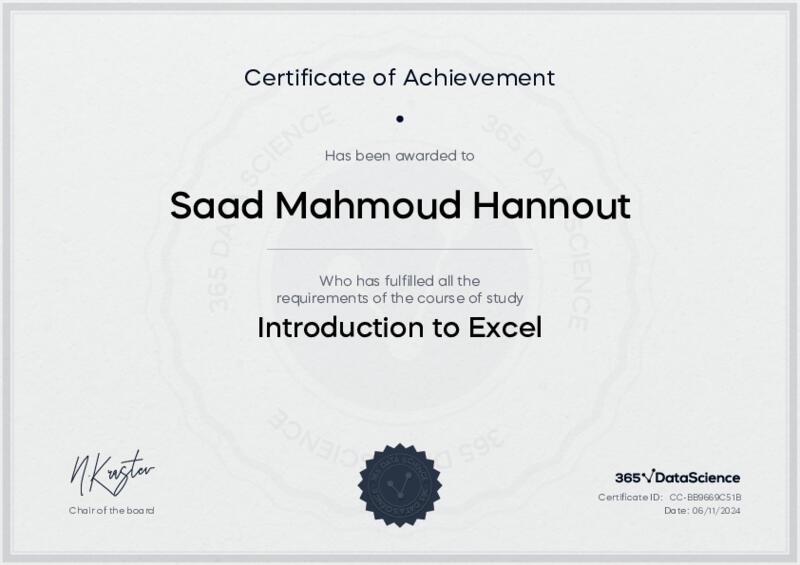 This user has been awarded the Introduction to Excel Certificate for successfully completing the course exam. Holding this certificate demonstrates their proficiency on the topic and signifies they are qualified to apply their newly acquired expertise in the fields of data analytics and data science.