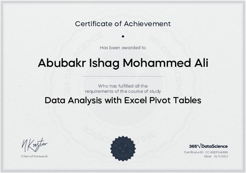 This user has been awarded the Data Analysis with Excel Pivot Tables Certificate for successfully completing the course exam. Holding this certificate demonstrates their proficiency on the topic and signifies they are qualified to apply their newly acquired expertise in the fields of data analytics and data science.