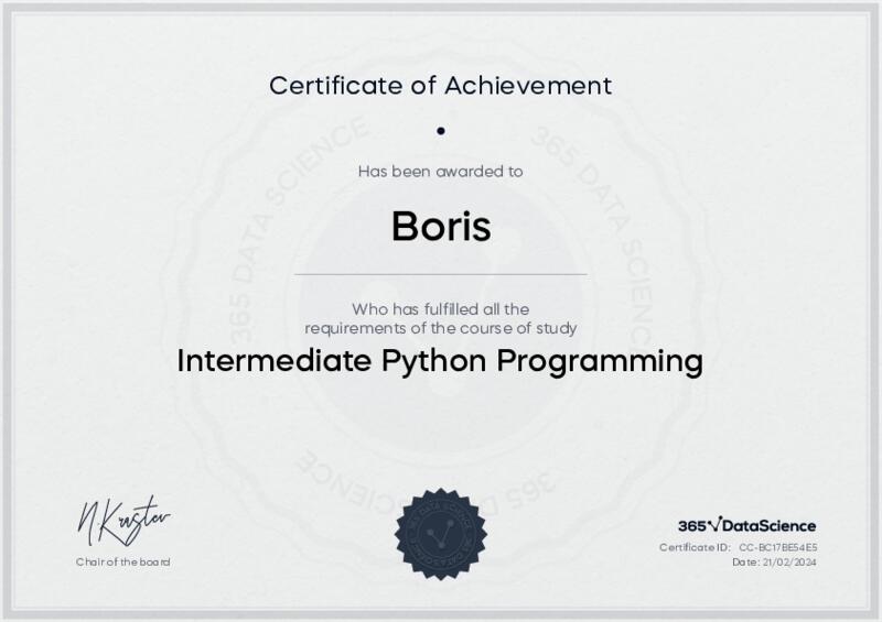 This user has been awarded the Intermediate Python Programming Certificate for successfully completing the course exam. Holding this certificate demonstrates their proficiency on the topic and signifies they are qualified to apply their newly acquired expertise in the fields of data analytics and data science.