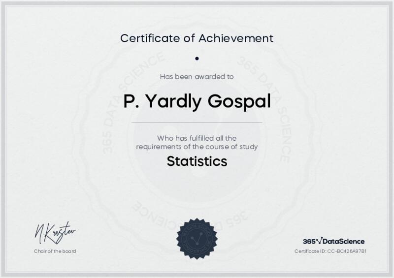 This user has been awarded the Statistics Certificate for successfully completing the course exam. Holding this certificate demonstrates their proficiency on the topic and signifies they are qualified to apply their newly acquired expertise in the fields of data analytics and data science.