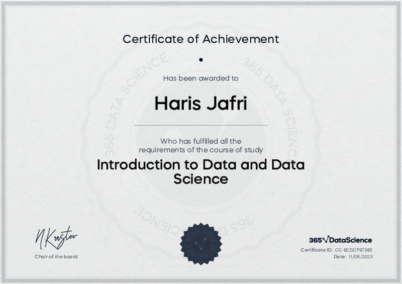This user has been awarded the Introduction to Data and Data Science Certificate for successfully completing the course exam. Holding this certificate demonstrates their proficiency on the topic and signifies they are qualified to apply their newly acquired expertise in the fields of data analytics and data science.
