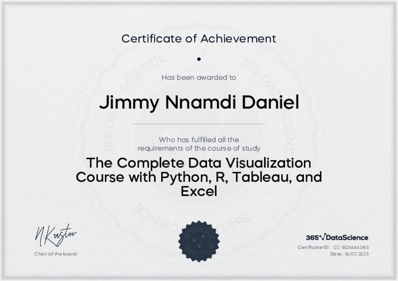 This user has been awarded the The Complete Data Visualization Course with Python, R, Tableau, and Excel Certificate for successfully completing the course exam. Holding this certificate demonstrates their proficiency on the topic and signifies they are qualified to apply their newly acquired expertise in the fields of data analytics and data science.