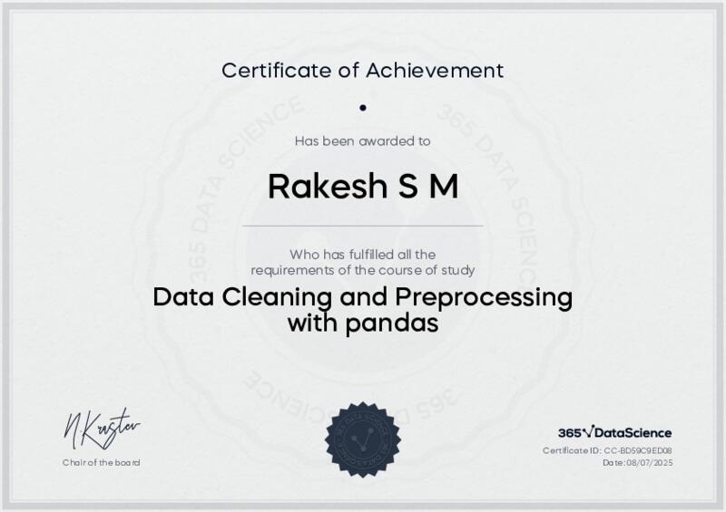 This user has been awarded the Data Cleaning and Preprocessing with pandas Certificate for successfully completing the course exam. Holding this certificate demonstrates their proficiency on the topic and signifies they are qualified to apply their newly acquired expertise in the fields of data analytics and data science.